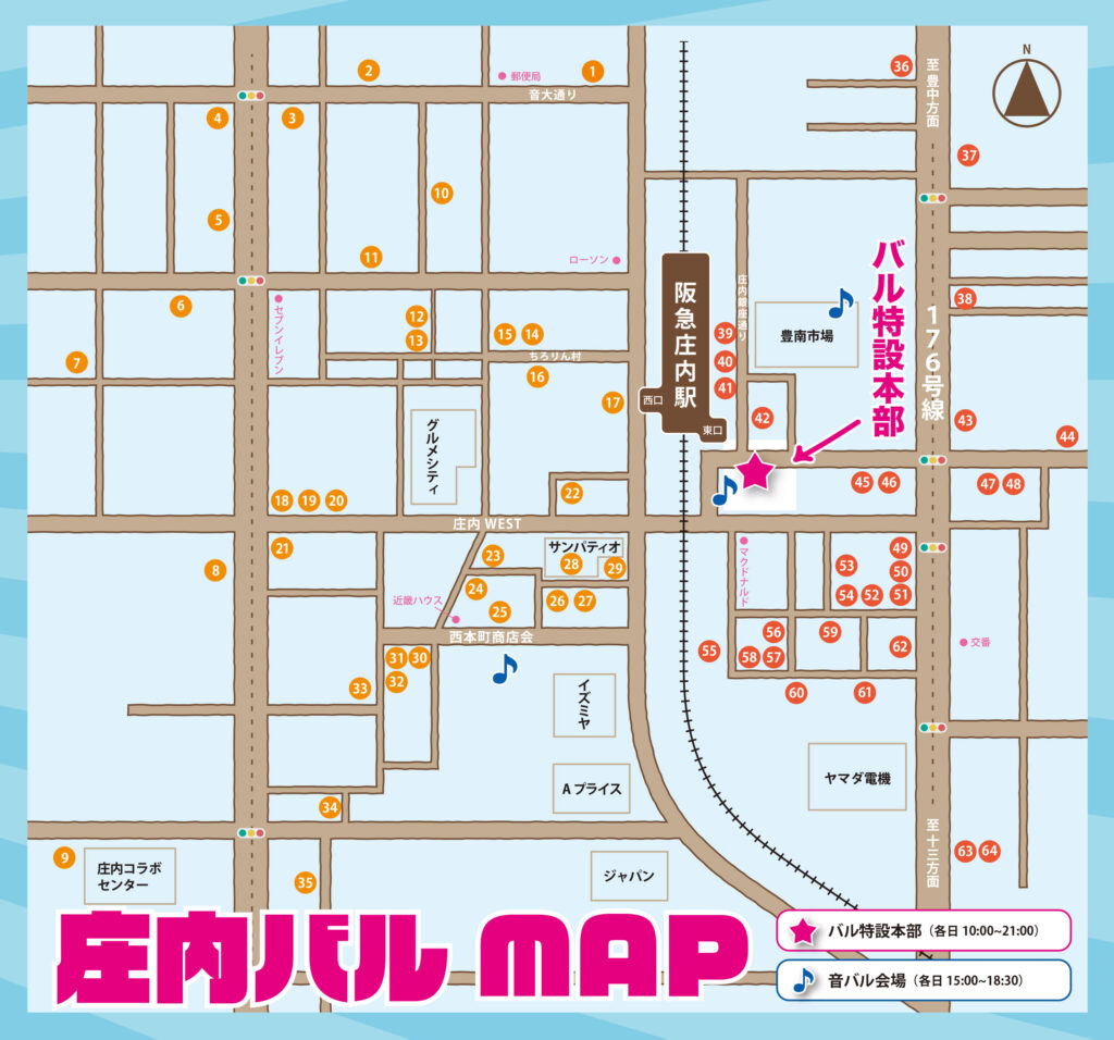 庄内駅を中心に東エリアと西エリア、合わせて64店舗が参加!